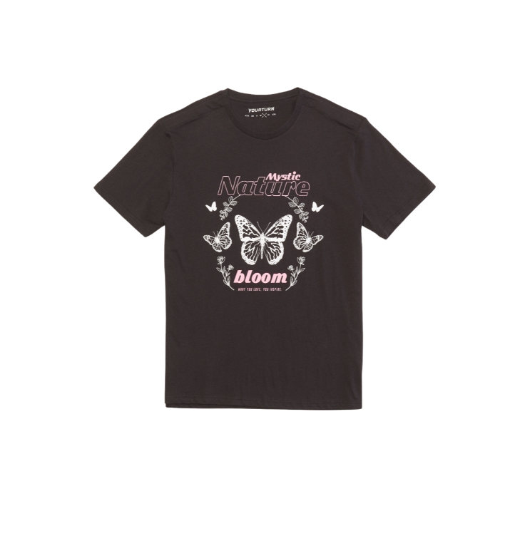 Vyr. marškinėliai, juodos spalvos, trumpomis rankovėmis, apvali kaklo iškirptė, spausdintas raštas.